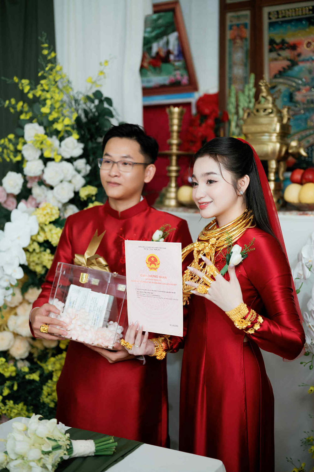 Cô dâu – chú rể được nhà trai trao tặng 5 lượng vàng 24K, 1 đôi hoa tai kim cương trị giá 160 triệu đồng, 1 tỷ đồng tiền mặt, 300 triệu đồng tiền nạp tài, 1 cặp nhẫn cưới kim cương.