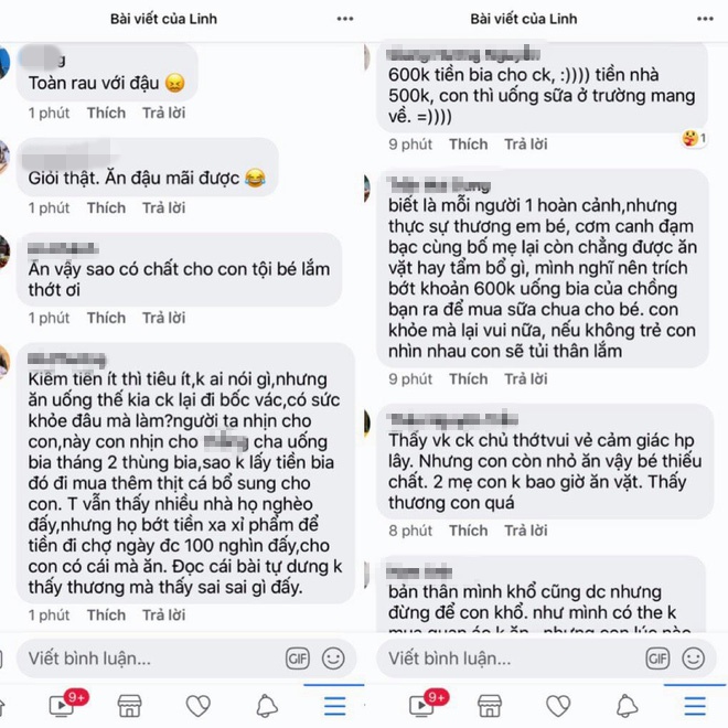 Facebook Minh Ngọc nói: "Người lớn mình không nói, chứ trẻ con ăn uống kham khổ thế tội quá. Trong khi bố nó uống bia thì hết hơn nửa tiền ăn cả tháng. Mà nhà bạn không ăn sáng hay sao ít vậy".
