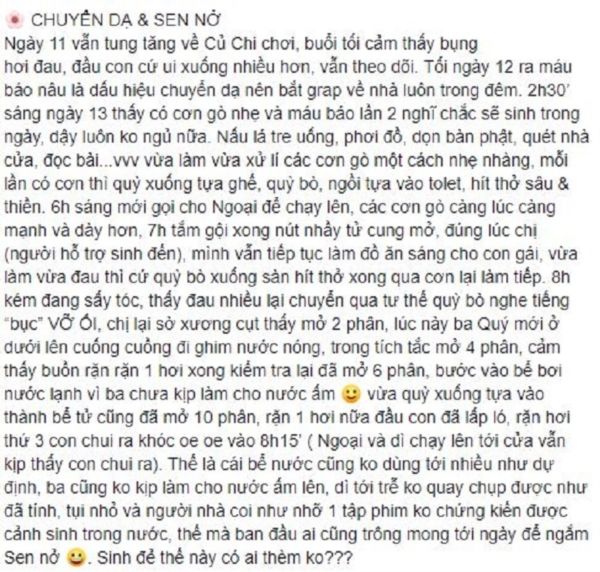Sau khi vượt cạn tại nhà thành công, người này đã lên mạng chia sẻ lại đầy đủ quá trình từ chuẩn bị từ khi mang thai, đến thời điểm chuyển dạ, 'sen nở' và cảm nhận sau sinh.