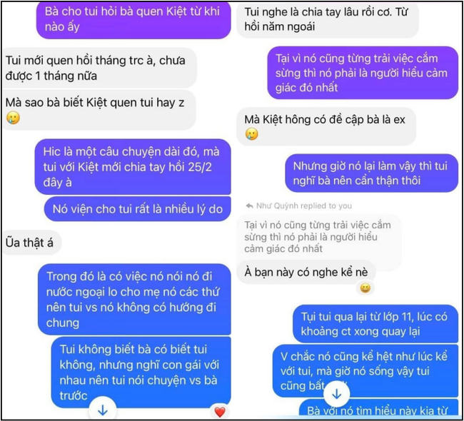 Đến ngày 13/4, sau khi tìm hiểu rõ ràng, mình quyết định nói chuyện với bạn nữ này. Mình rất sốc khi biết tin K. nói dối bạn ấy đã chia tay mình từ hồi năm ngoái trong khi cả hai còn yêu nhau", cô gái kể.