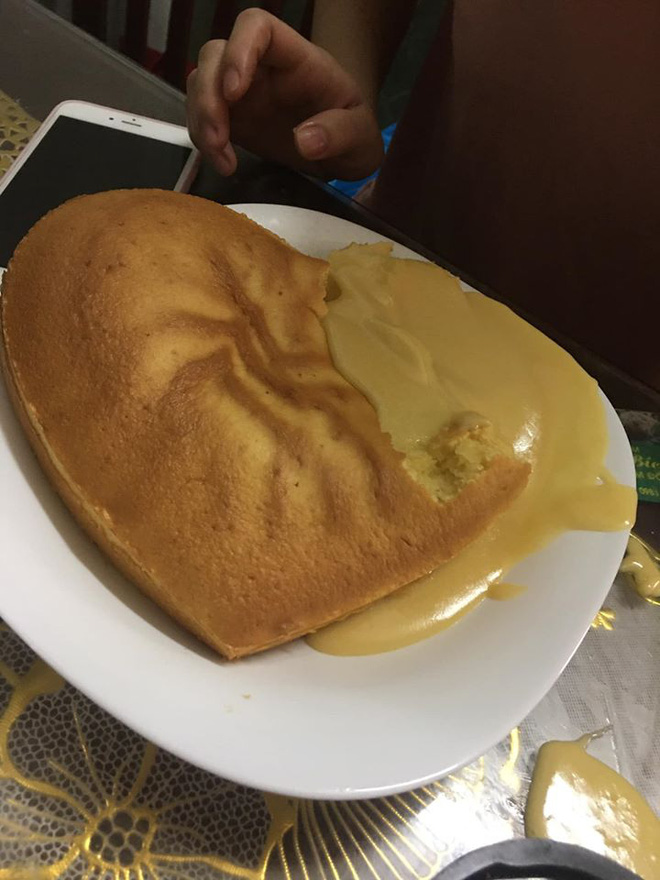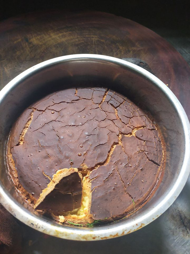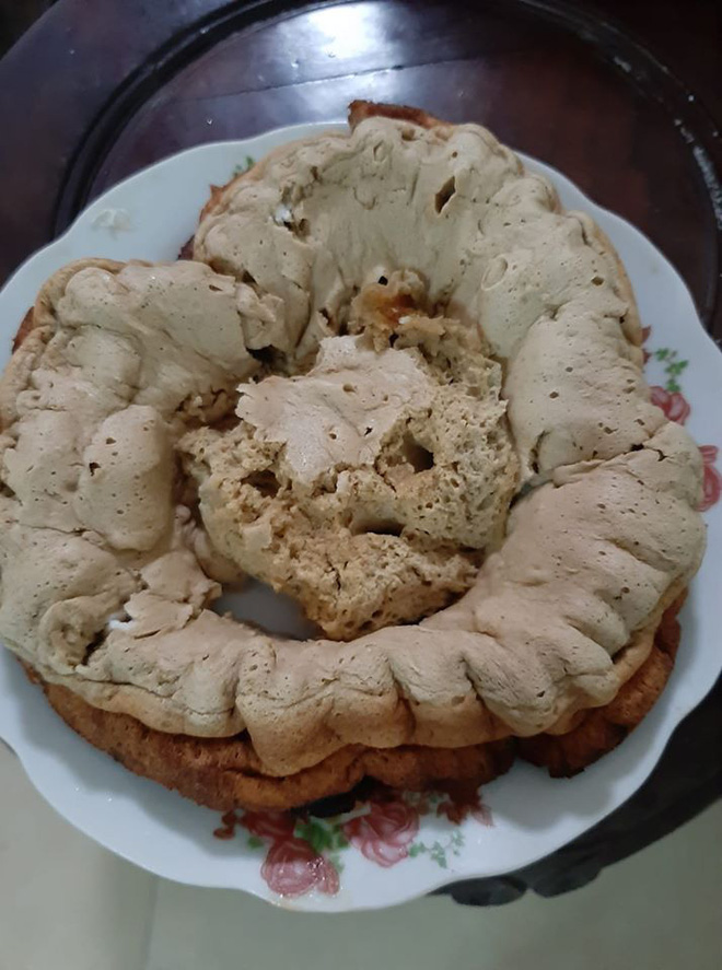 Mới đây, hình ảnh chiếc bánh bông lan sau khi hấp xong cứng như đá, người đứng lên không vỡ đã nhận về đến 21 nghìn like. Đúng như tên gọi, đáng lẽ chiếc bánh bông lan phải mềm mại, bồng bềnh. Thế nhưng sản phẩm làm ra ở đây lại cứng như đá, khó giải thích làm sao.