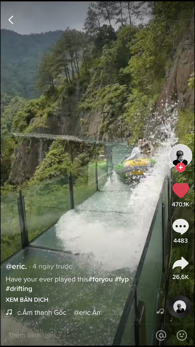 Như mới đây, người dùng TikTok lại được một phen "khiếp vía" trước đoạn clip trải nghiệm chiếc máng trượt bằng kính ở Trung Quốc. Chỉ vừa đăng tải từ 4 ngày trước, đến nay video đã thu về hơn 10,3 triệu lượt xem, 470,1k likes, hơn 4,4k bình luận cùng 26,6k lượt chia sẻ từ cư dân mạng.