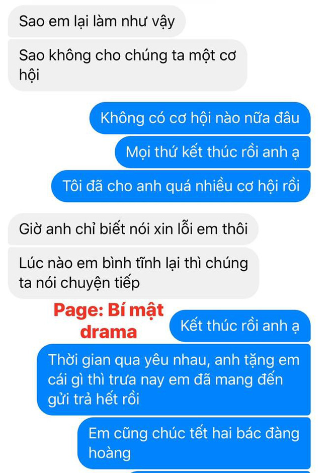Cô gái có đăng kèm những dòng tin nhắn anh ta gửi khi mọi việc vỡ lở. Người đàn ông đó muốn được cho thêm cơ hội, muốn cô gái bình tĩnh lại để nói chuyện tiếp nhưng không được. Mối tình đó và chuyện kết hôn đã hoàn toàn chấm dứt.