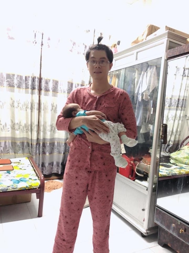 Phía dưới bài đăng là hình ảnh ông bố bỉm sữa diện nguyên bộ đồ ngủ màu hồng của vợ, tóc buộc chỏm đỉnh đầu, đứng giữa nhà bế con.