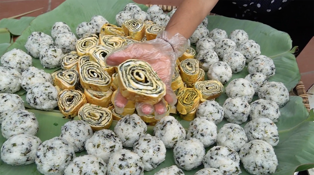 Các công đoạn ngày hôm nay có vẻ phức tạp hơn đôi chút vì bà Tân làm tới 2 món. Sau khi nấu một nồi cơm to để làm cơm nắm trộn rong biển, bà Tân lại đi đánh trứng để làm trứng cuộn. Món trứng này của bà Tân đặc biệt hơn một chút vì có lớp rong biển cuộn xen kẽ ở giữa, không chỉ làm món trứng ngon hơn mà nhìn cũng hấp dẫn hơn. Mặc dù món trứng cuộn này khá tỉ mẩn nhưng bà Tân làm thành công một cách nhanh chóng.