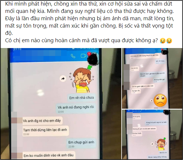 Khi mình phát hiện, chồng xin tha thứ, xin cơ hội sửa sai và chấm dứt mối quan hệ kia. Mình đang suy nghĩ liệu có tha thứ được hay không. Đây là lần đầu mình phát hiện nhưng bị ám ảnh dã man, mất lòng tin, mất sự tôn trọng, mất cảm xúc khi gần chồng. Bị sốc và thất vọng tột độ. Có chị em nào cùng hoàn cảnh mà đã vượt qua được không ạ?".