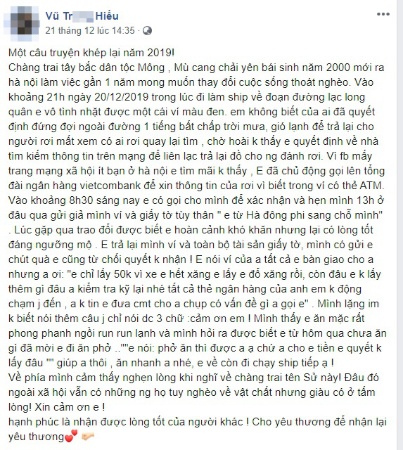Theo đó, anh Hiếu đã đăng bài tìm ví bị đánh rơi vào khuya 20/12 và sang ngày hôm sau đã nhận được cuộc gọi hẹn trả ví của cậu thanh niên. Hành động tử tế của chàng trai trẻ được dân mạng nhiệt tình khen ngợi, ủng hộ.