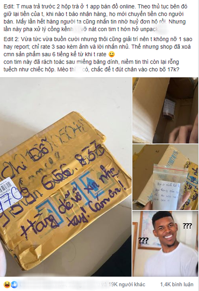 Chẳng là mình mua trả trước 2 hộp trà ở 1 app bán đồ online. Theo thủ tục bên đó giữ lại tiền của mình, khi nào mình báo nhận hàng, họ mới chuyển tiền cho người bán. Mấy lần hết hàng người ta cũng nhắn tin nhờ huỷ đơn hộ rồi. Nhưng lần này pha xử lý cồng kềnh làm vỡ nát con tim mình luôn.