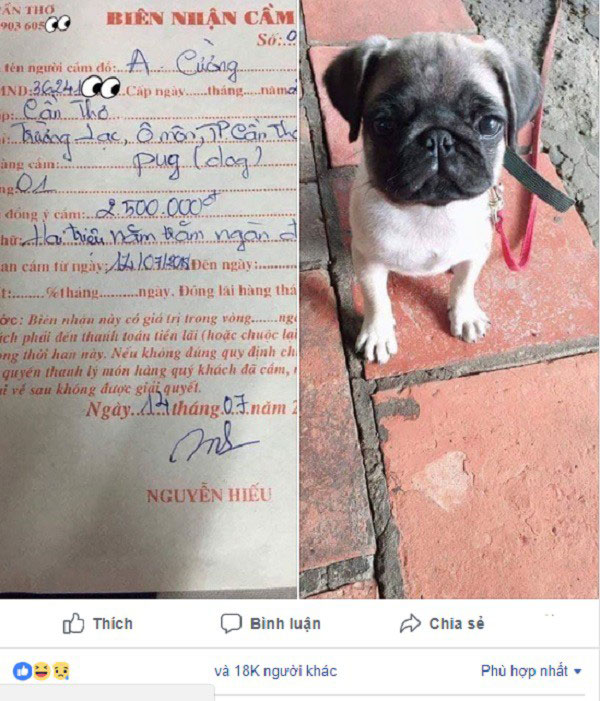 Cách đây khoảng một năm trước, trên mạng xã hội được dịp xôn xao trước tờ giấy cầm cố của "chủ nhân" khi bắt buộc đổi chú chó cưng lấy 2,5 triệu đồng. Hình ảnh chú chó cưng với khuôn mặt đáng thương khiến người dùng mạng ngày ấy vừa bất ngờ vừa có những bình luận trái chiều.
