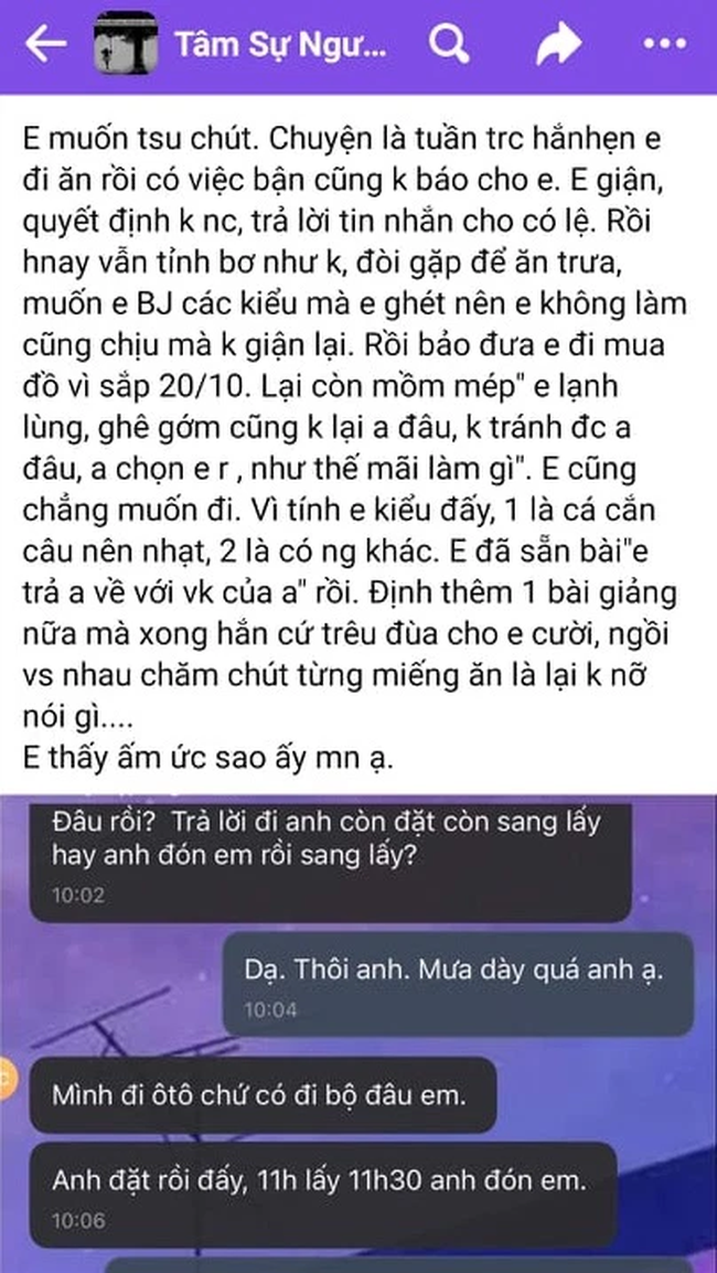 Cô ta bỏ bê cả người tình chuyện ân ái, làm nũng đủ kiểu. Nực cười ở chỗ, tiểu tam này còn "cành cao": "Em đã sẵn bài 'em trả anh về với vợ anh rồi'... Em thấy ấm ức sao ấy mọi người ạ".