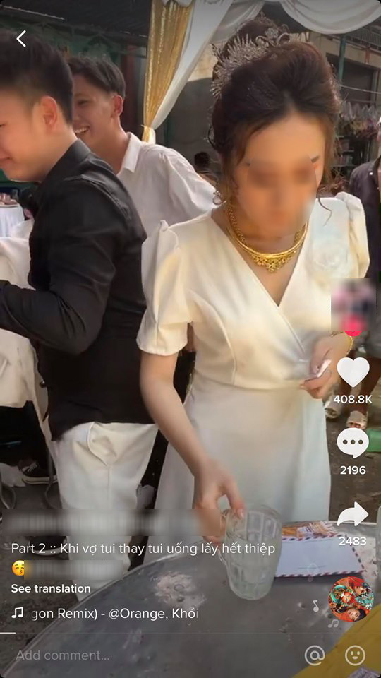 Cụ thể, khi chúc rượu đến bàn của hội bạn thân, cô dâu chú rể được yêu cầu là phải uống bia thì mới được nhận phong bì. Chú rể có lẽ đã phải uống quá nhiều rồi nên cô dâu đích thân "ra trận".
