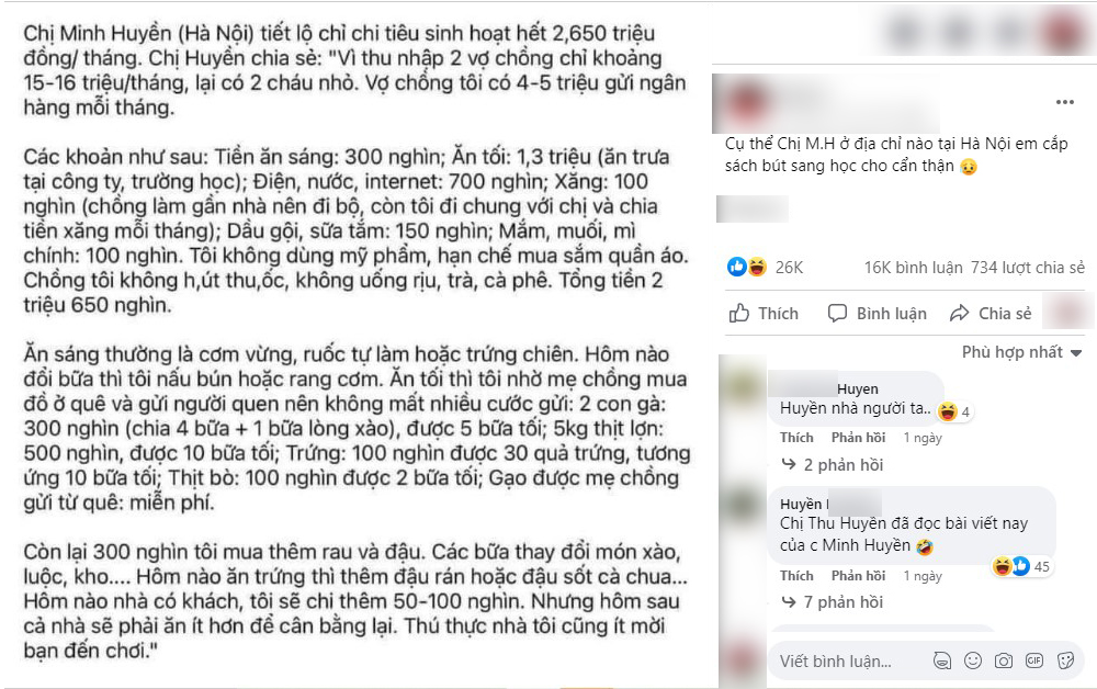 Mới đây, dân mạng truyền tay nhau bảng chi tiêu chi tiết của chị Minh Huyền ở Hà Đông, Hà Nội khi chi phí sinh hoạt một tháng chỉ là 2 triệu 650 nghìn đồng.