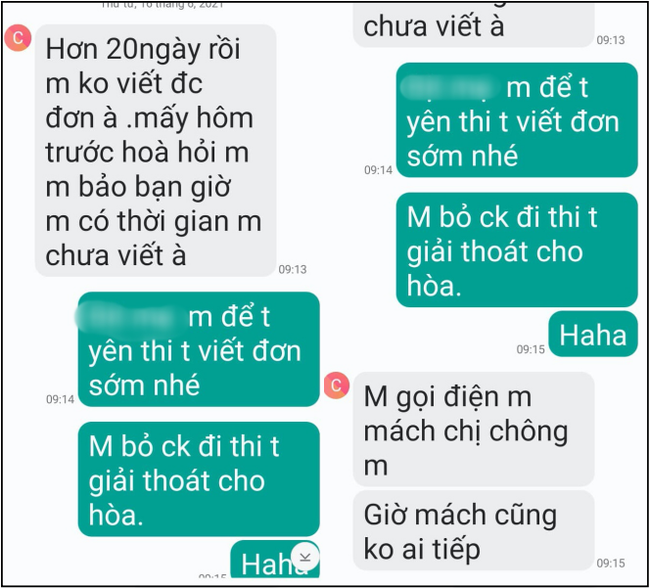 - Mày để tao yên thì tao viết đơn sớm nhé. Mày bỏ chồng đi thì tao giải thoát cho H.