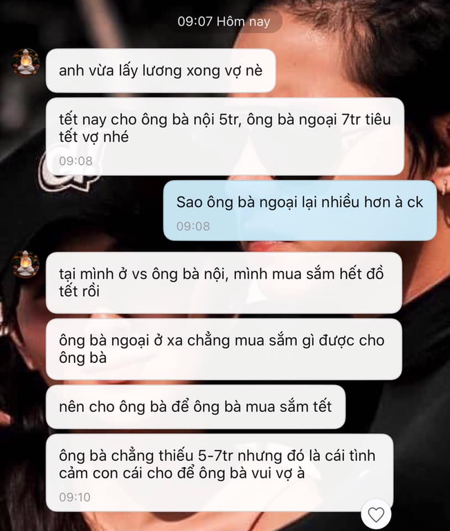 "- Anh vừa lấy lương xong vợ nè. Tết nay cho ông bà nội 5 triệu, ông bà ngoại 7 triệu tiêu Tết vợ nhé.