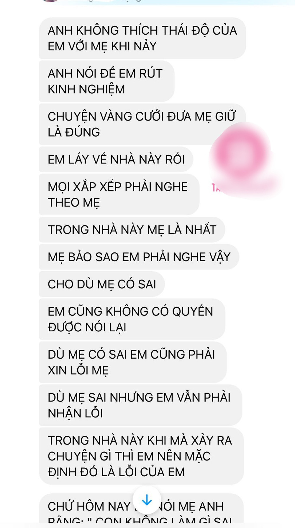 Có lẽ, ai đọc xong tất cả những tin nhắn này cũng phải bàng hoàng, hoảng hốt. Người chồng bất chấp mẹ mình đúng hay sai thì cũng ép buộc vợ phải nhận lỗi.