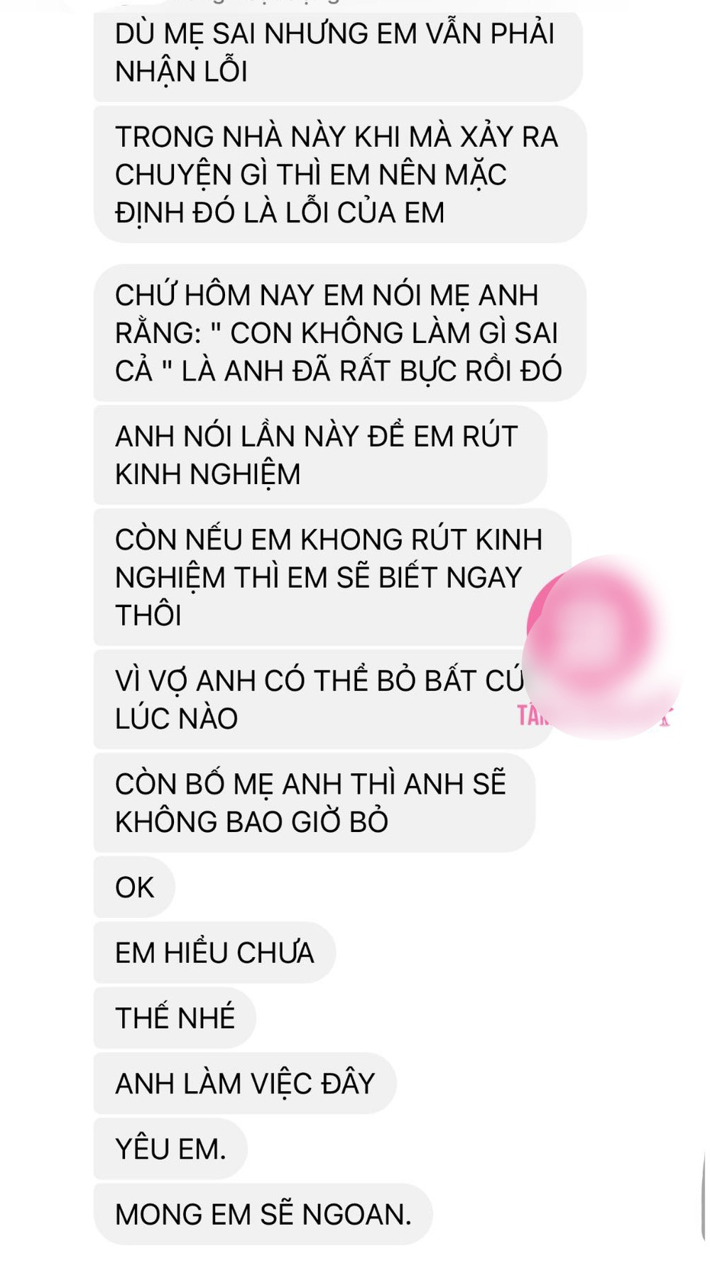 Mới đây, những tin nhắn do ông chồng gửi cho vợ gây chú ý. Theo đó, anh ta thể hiện sự gia trưởng, bênh mẹ và không quan tâm vợ nghĩ gì.