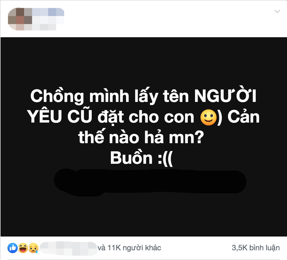 Mới đây, dân mạng lại được chứng kiến một câu chuyện tương tự khi anh chồng lấy tên người yêu cũ đặt cho con khiến chị vợ vô cùng buồn bã. Theo đó, chị A.B chia sẻ: "Chồng mình lấy tên NGƯỜI YÊU CŨ đặt cho con. Cản thế nào hả mọi người? Buồn".