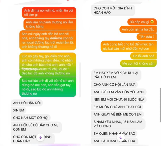 Lúc nó gãy tay gọi điện cho anh, anh không thèm đến. Nó nhắn tin cho anh bảo nhớ anh, anh nói: ‘Nghịch ngu được thì chịu được’ sao lúc đó anh không thương nó. Sao cái lúc anh đi với bồ, nó xin anh đừng bỏ mẹ con, anh vẫn gạt tay nó đi. Sao lúc đó anh không thương nó”.