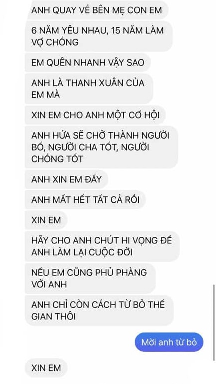 “Anh biết em vẫn còn yêu anh nên mới chưa đi bước nữa. Em muốn chờ anh thay đổi, anh quay về bên mẹ con em. 6 năm yêu nhau, 15 năm làm vợ chồng, em quên nhanh vậy sao? Anh là thanh xuân của em”, anh chồng viết.