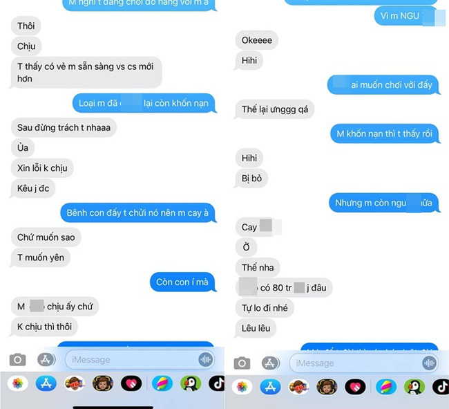 "- Có vẻ cay cú khi mất chồng, thôi, mai chuyển khoản nốt 80 triệu rồi cút. Con cũng không cần, giữ mà nuôi. Mai chuyển khoản xong thì đừng có liên quan. Có vẻ cay thế nhỉ? Tiếc à.