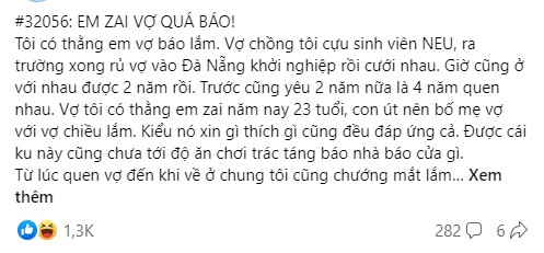 "Tôi có thằng em vợ báo lắm. Tôi ra trường xong rủ vợ vào Đà Nẵng khởi nghiệp rồi cưới nhau. Giờ cũng ở với nhau được 2 năm rồi. Trước cũng yêu 2 năm nữa là 4 năm quen nhau. Vợ tôi có thằng em trai năm nay 23 tuổi, con út nên bố mẹ vợ với vợ chiều lắm. Kiểu nó xin gì thích gì cũng đều đáp ứng cả. Được cái cậu này cũng chưa tới độ ăn chơi trác táng báo nhà báo cửa gì.