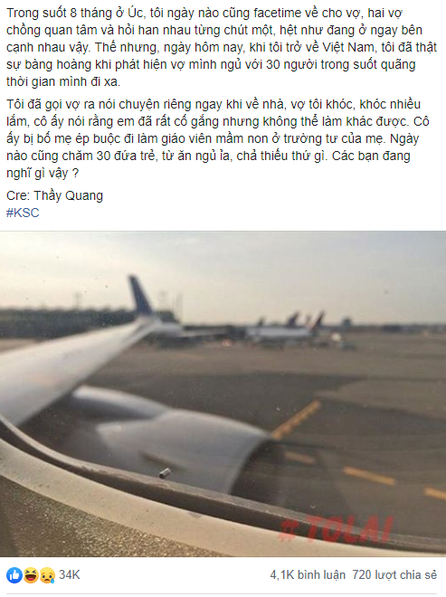 Trong suốt 8 tháng ở Úc, tôi ngày nào cũng facetime về cho vợ, hai vợ chồng quan tâm và hỏi han nhau từng chút một, hệt như đang ở ngay bên cạnh nhau vậy. Thế nhưng, ngày hôm nay, khi tôi trở về Việt Nam, tôi đã thật sự bàng hoàng khi phát hiện vợ mình ngủ với 30 người trong suốt quãng thời gian mình đi xa.