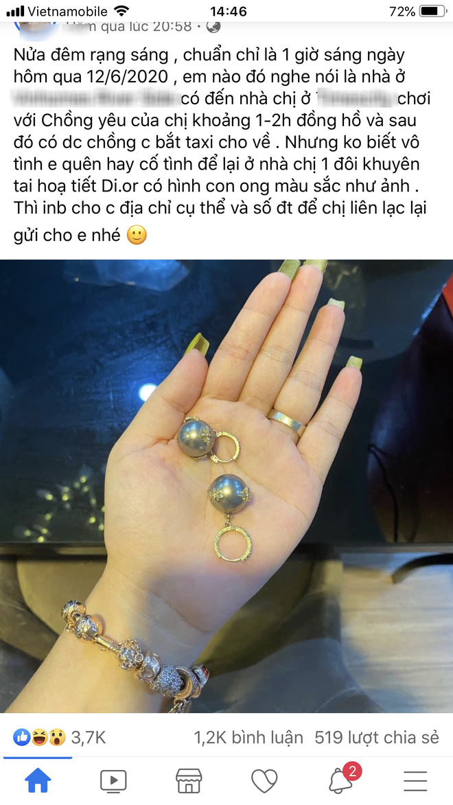 Sau 1-2 giờ đồng hồ, cô gái này được chồng chị bắt taxi cho về, nhưng không biết do vô tình hay cố ý có để lại nhà chị đôi khuyên tai. Chị K.A nhắn tìm chủ nhân đôi hoa tai với mong muốn liên lạc lại để gửi trả.