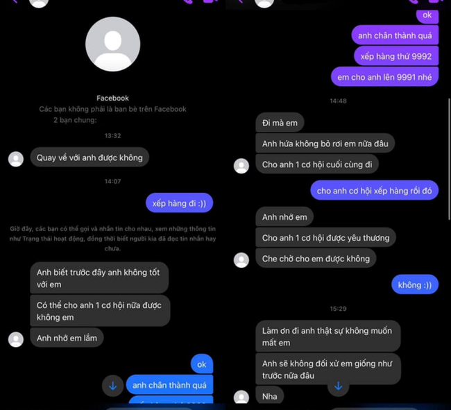 - Anh biết trước đây anh không tốt với em, có thể cho anh một cơ hội nữa được không em? Anh nhớ em lắm”.