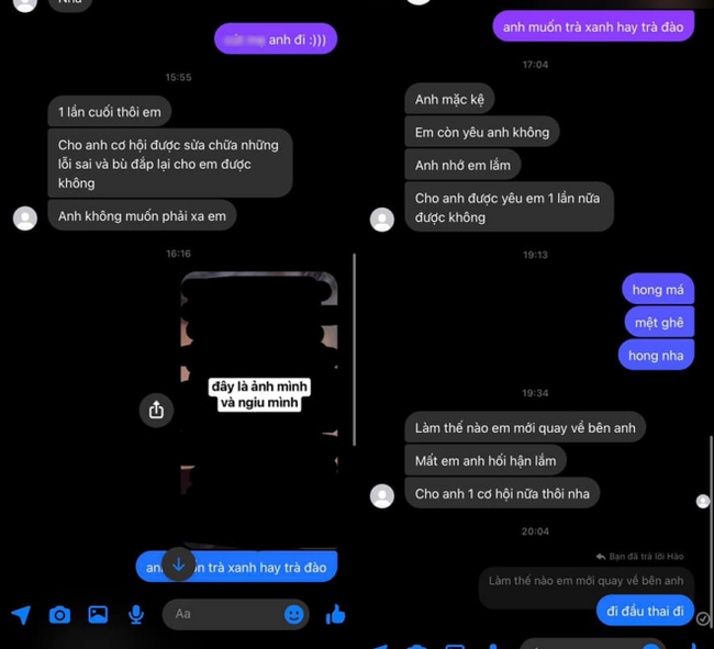 Đi kèm với câu chuyện kể chính là những dòng tin nhắn mà anh chàng người yêu gửi qua. Sau một thời gian, có lẽ thấy chẳng ai bằng được tình cũ nên bắt đầu lao vào tìm kiếm cơ hội.