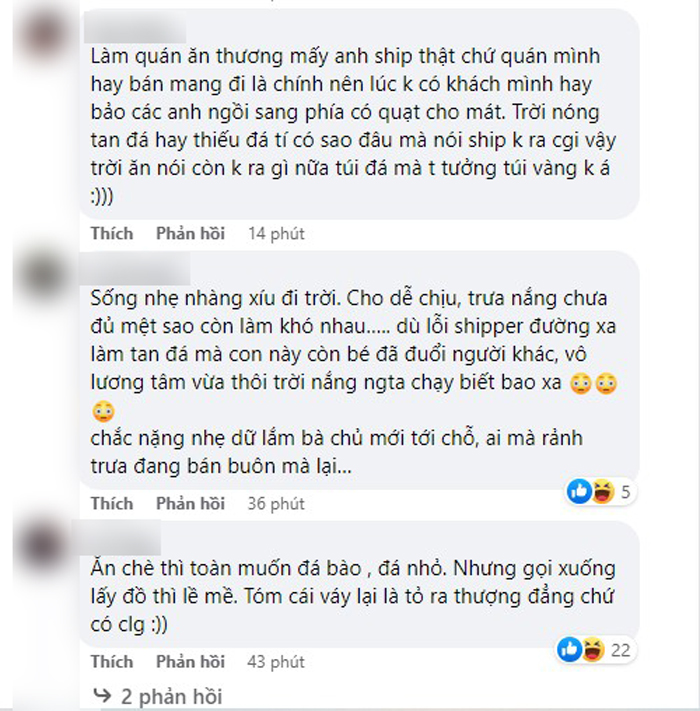 Có lẽ vì bất mãn với hành động của em gái nên chị chủ quán chè đã đến tận phòng trọ để giáo huấn. “Không có đá em nói một câu thôi là chị bảo anh ship chạy ra ngoài mua cho em, ngay đây thiếu gì đá. Ship đi bao nhiêu cây số nắng nôi mà em đuổi người ta. Em nghĩ 35k của em to à?” – chị chủ quán nói.