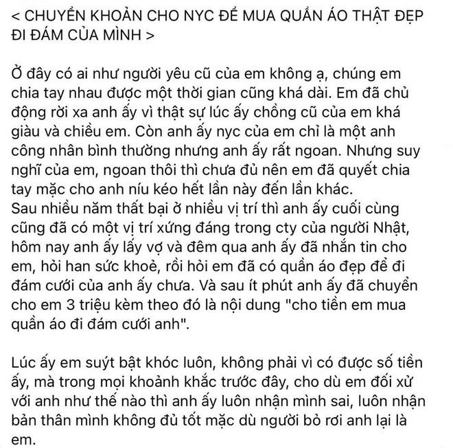 Sau nhiều năm không gặp, anh chàng chủ động liên hệ lại với bạn nữ, hỏi han sức khỏe và gửi mời tới dự đám cưới của mình cho bạn nữ. Nghe bạn gái cũ "than thân trách phận" không có quần áo đẹp, anh ta chủ động chuyển khoản 3 triệu đồng kèm lời nhắn: "Anh muốn cho mọi người thấy người yêu cũ của anh đã xinh còn thành đạt. Để mọi người thấy, em chủ động rời bỏ anh là điều đúng đắn".