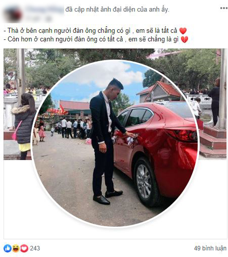 N.C nhanh chóng gửi lời xin lỗi đến toàn thể mọi người. Anh chàng liên tục đăng dòng trạng thái để mong mọi người hiểu về chuyện buồn không đáng có này: "Nhiều người không trong cuộc cũng nói. Thật sự nếu không yêu thương vợ tôi thật lòng thì tôi lấy vợ tổ chức linh đình như vậy làm gì", "Thà ở bên cạnh người đàn ông chẳng có gì, em sẽ là tất cả. Còn hơn ở cạnh người đàn ông có tất cả, em sẽ chẳng là gì"…