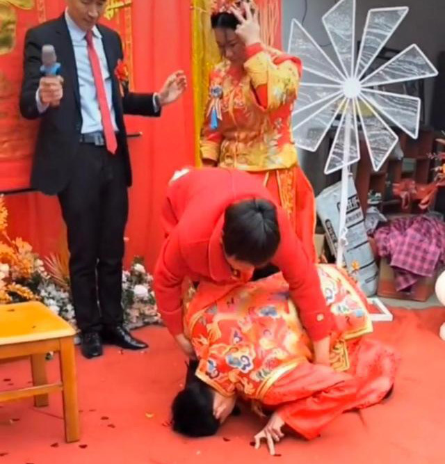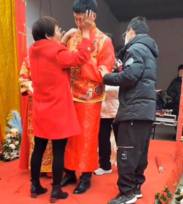 Người mẹ phải lại gần đỡ con dậy, giúp con phấn chấn tinh thần tiếp tục hôn lễ. Được biết, bố chú rể ở xa không thể về tổ chức đám cưới cho con trai, mọi việc do người mẹ kế lo liệu. Dù không phải là người sinh ra chú rể nhưng người mẹ kế này đã đối xử với cậu rất tốt, như chính con ruột của bà.