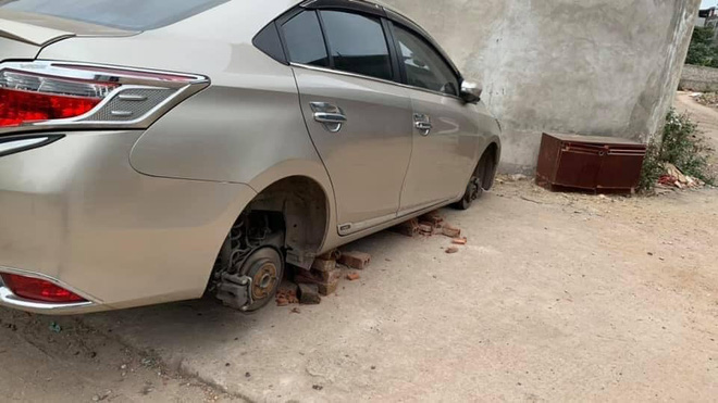 - Chắc chúng đi theo nhóm thì mới có thể nâng xe lên, kê gạch vào thế kia. Thông thường bọn trộm thường vặt gương chứ ít khi lấy cả 4 bánh xe như thế này.