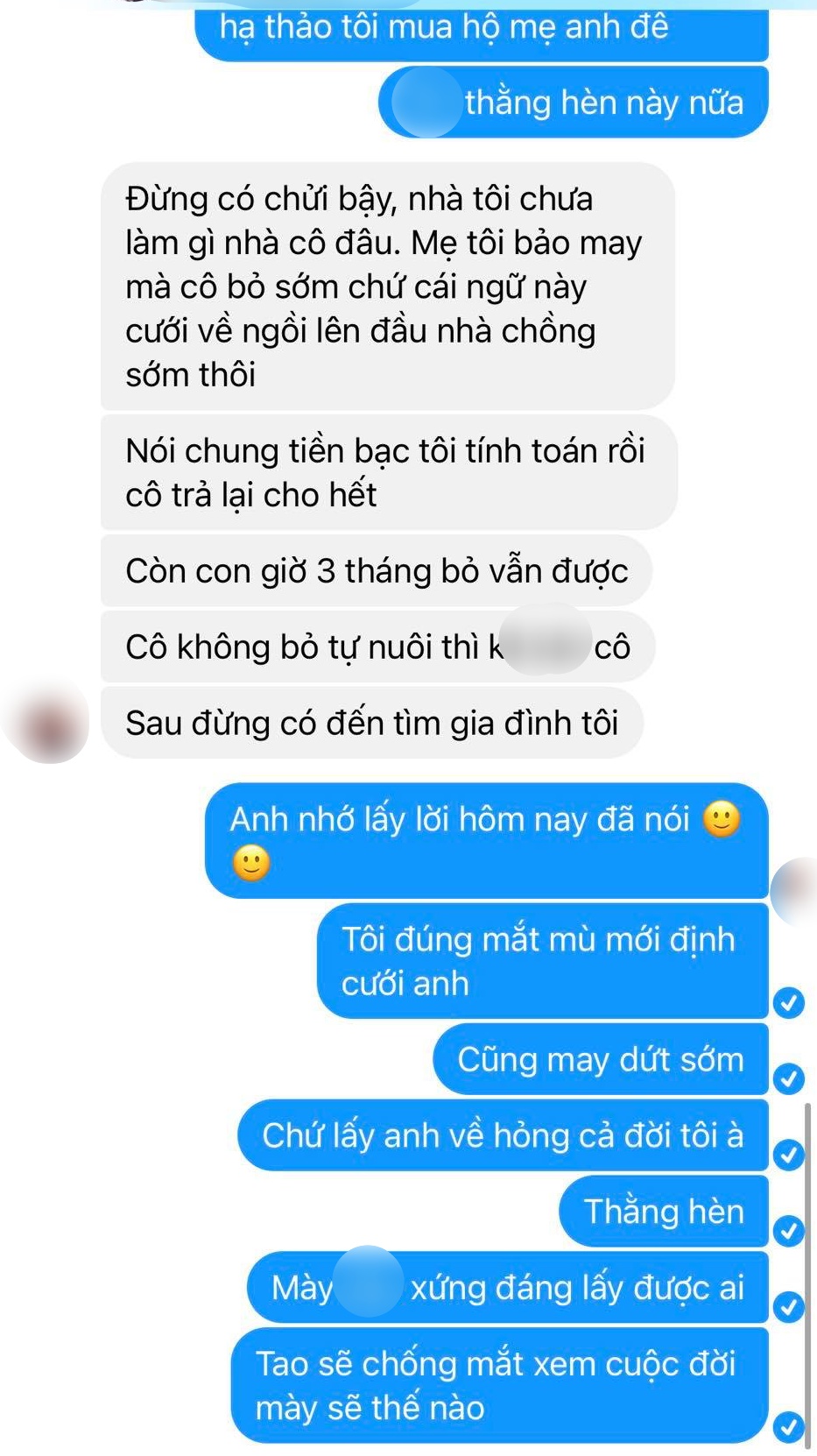 “Còn con 3 tháng vẫn bỏ được. Cô không bỏ thì tự nuôi, sau đừng tìm đến gia đình tôi”, anh ta nhắc đến đứa trẻ.