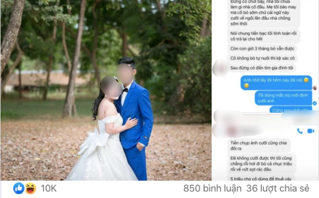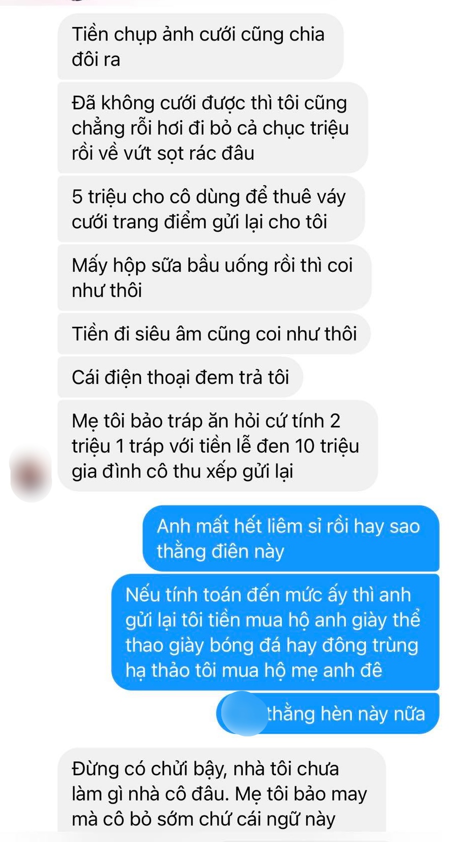 “Tiền chụp ảnh cuới chia đôi ra. 5 triệu cho cô dùng thuê váy cưới trang điểm gửi lại tôi. Mấy hộp sữa bầu uống rồi coi như thôi, tiền siêu âm coi như thôi. Cái điện thoại đem trả tôi”, anh ta viết.