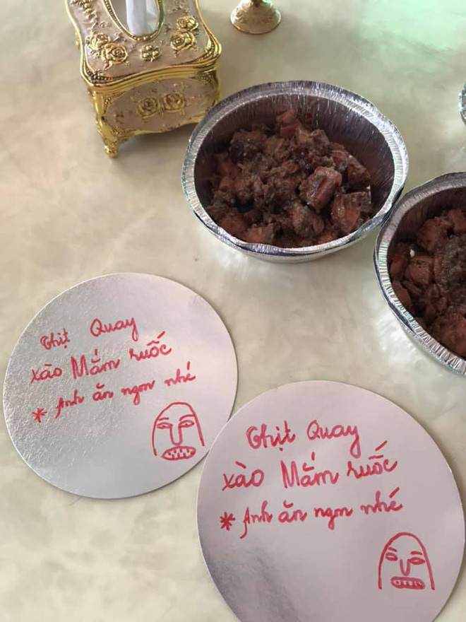 "Thịt quay xào mắm ruốc, anh ăn ngon nhé" - cô viết trên tấm thiệp.