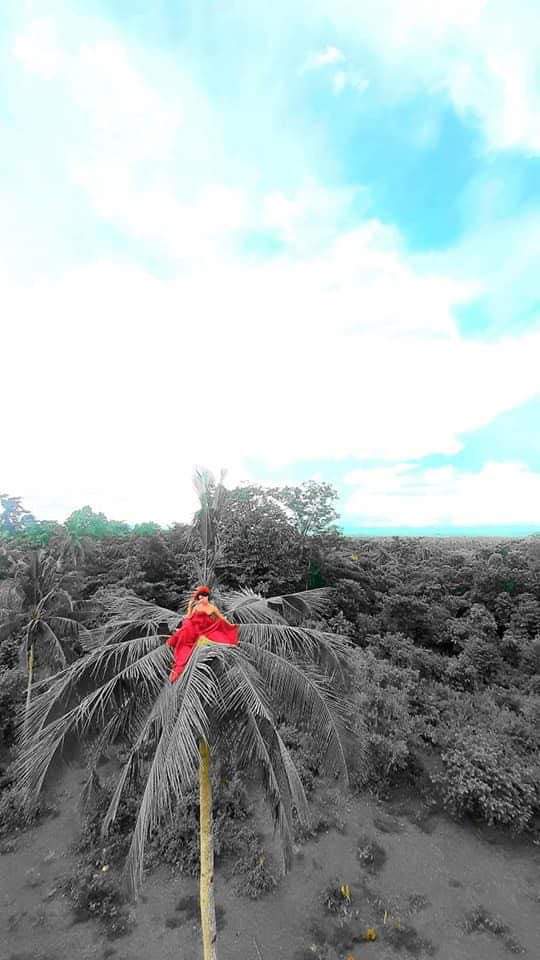 Theo đó, thay vì đến studio tạo dáng truyền thống thì người đàn ông này lại thoăn thoắt leo lên ngọn cây dừa cao chót vót. Anh chàng còn mặc một chiếc váy đỏ rực rỡ nổi bật giữa màu xanh của cây cối xung quanh. Cách tạo dáng trên ngọn cây của anh cũng vô cùng chuyên nghiệp, hệt như những người mẫu lành nghề.