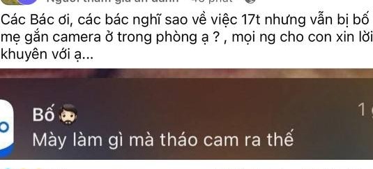 Mới đây, trong một hội nhóm trên Facebook, một nam sinh 17 tuổi đã chia sẻ câu chuyện tương tự mình vừa gặp phải khiến nhiều người suy ngẫm. Theo đó, cậu bé này tâm sự: "Các bác ơi, các bác nghĩ sao về việc 17 tuổi nhưng vẫn bị bố mẹ gắn camera ở trong phòng ạ? Mọi người cho con xin lời khuyên với ạ".