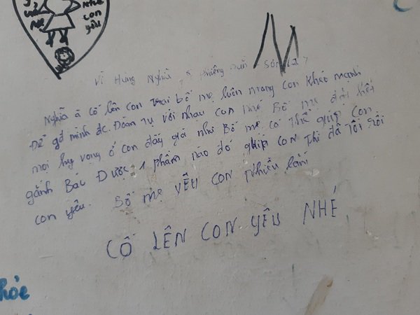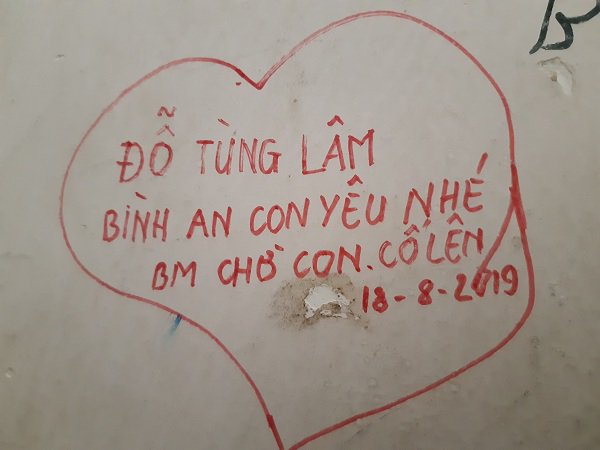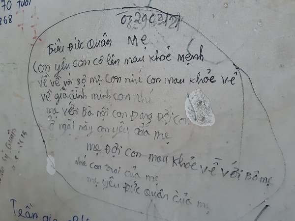 Con gái 8 tháng tuổi dù đã được mổ xong, nhưng chị Lê Thị Thu Thảo (SN 1994) vẫn chưa hết lo lắng khi con vẫn phải nằm trong phòng hồi sức. Khi mỏi mòn chờ đợi đến giờ được vào thăm con, chị Thảo viết lên bức tường họ tên con, cùng lời nhắn: “Đỗ Tùng Lâm! Bình an con yêu nhé, bố mẹ chờ con, cố lên”.