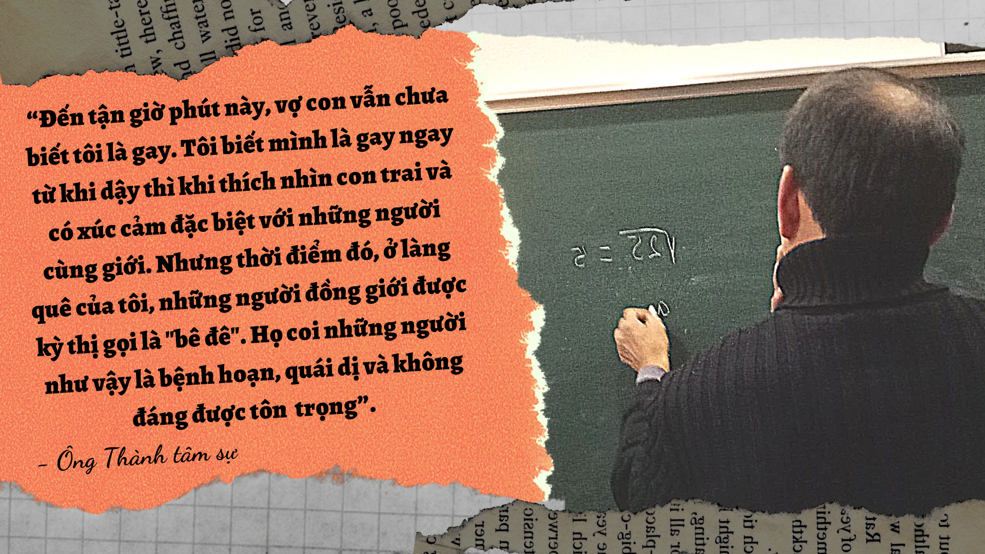 Ông Nguyễn Kim Thành (51 tuổi), quê ở Hưng Yên đã chuyển lên Hà Nội sống được 2 năm nay với con trai. Ông là một giáo viên chuyên Toán có tiếng với học sinh. Ông bắt đầu kể về câu chuyện của "cậu bé Thành" ngày nào. Chúng tôi cũng không hiểu vì quá đau khổ hay sự chất chứa đã ở đỉnh điểm mà khi chia sẻ với chúng tôi, ông Thành như khóc nấc lên từng cơn: "Đến tận giờ phút này, vợ con vẫn chưa biết tôi là gay. Tôi biết mình là gay ngay từ khi dậy thì khi thích nhìn con trai và có xúc cảm đặc biệt với những người cùng giới. Nhưng thời điểm đó, ở làng quê của tôi, những người đồng giới được kỳ thị gọi là bê đê. Họ coi những người như vậy là bệnh hoạn, quái dị và không đáng được tôn trọng".