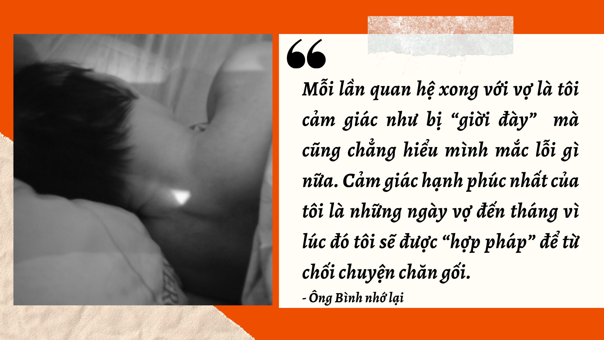 Còn với ông Thành thì không chỉ không có được tiếng nói chung trong đời sống hôn nhân mà mỗi lần quan hệ với vợ còn chính là một ký ức đau khổ: "Mỗi lần quan hệ xong với vợ là tôi cảm giác như bị "giời đày" mà cũng chẳng hiểu mình mắc lỗi gì nữa. Cảm giác hạnh phúc nhất của tôi là những ngày vợ đến tháng vì lúc đó tôi sẽ được "hợp pháp" để từ chối chuyện chăn gối".