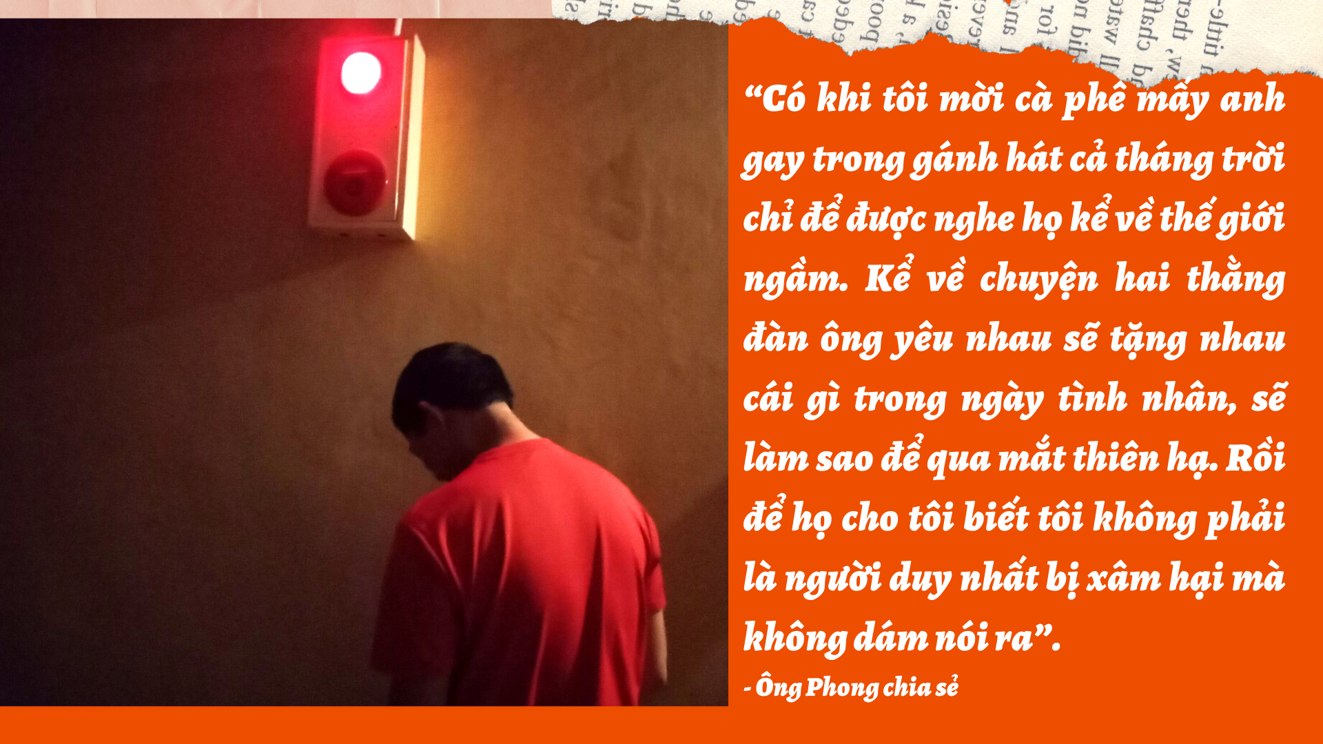 Ông Phong - người đàn ông bị xâm hại cũng lựa chọn như hai người cùng cảnh của mình. Ông vào Sài Gòn lập nghiệp, lấy vợ. Ở đây, ông bắt gặp được nhiều người "cùng dấu" với mình. Ông chủ động chơi thân để tìm hiểu về thế giới ngầm mà ông còn nhiều mơ hồ. Ông Phong tâm sự, từng dòng ký ức buồn về những ngày mời cà phê cả gánh hát cải lương để "gỡ rối tâm trạng" ùa về: "Có khi tôi mời cà phê mấy anh gay trong gánh hát cả tháng trời chỉ để được nghe họ kể về thế giới ngầm. Kể về chuyện hai thằng đàn ông yêu nhau sẽ tặng nhau cái gì trong ngày tình nhân, sẽ làm sao để qua mắt thiên hạ. Rồi để họ cho tôi biết tôi không phải là người duy nhất bị xâm hại mà không dám nói ra".