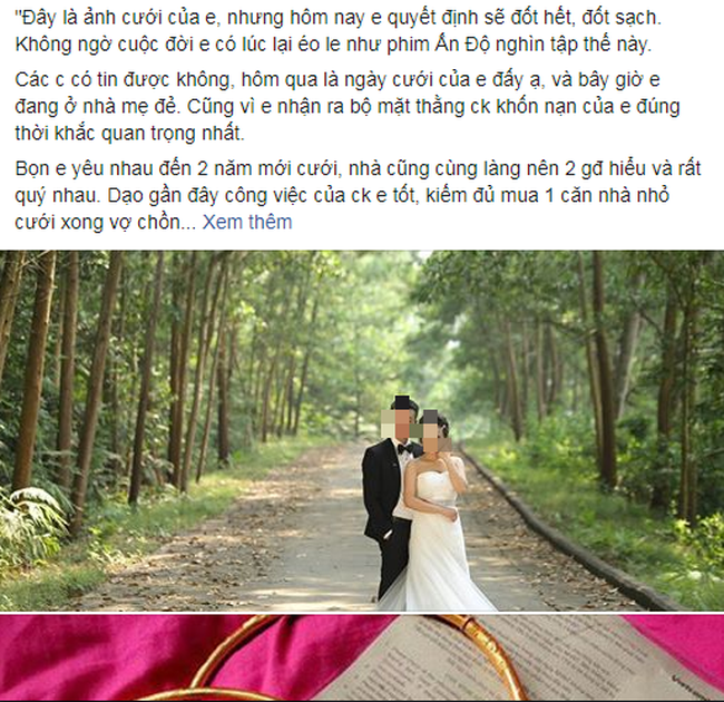 Tài khoản facebook Mai Anh Nguyễn chia sẻ trên 1 diễn đàn: "Đây là ảnh cưới của em, nhưng hôm nay em quyết định sẽ đốt hết, đốt sạch. Không ngờ cuộc đời em có lúc lại éo le như phim Ấn Độ nghìn tập thế này.