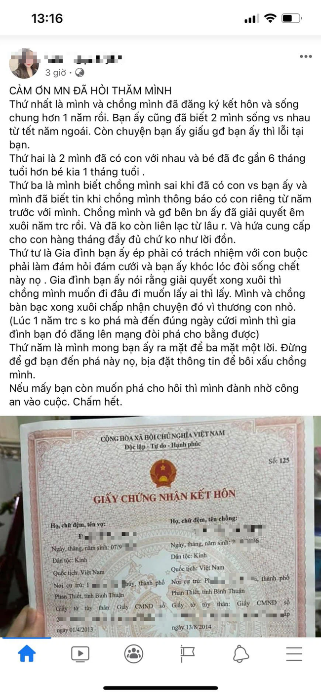 Thứ 3 là mình biết chồng mình sai khi đã có con với bạn ấy và mình biết tin khi chồng mình thông báo có con riêng từ năm trước với mình. Chồng mình và gia đình bên bạn ấy đã giải quyết êm xuôi năm trước rồi. Và đã không còn liên lạc từ lâu rồi. Và hứa chu cấp cho con đầy đủ hàng tháng chứ không như lời đồn.