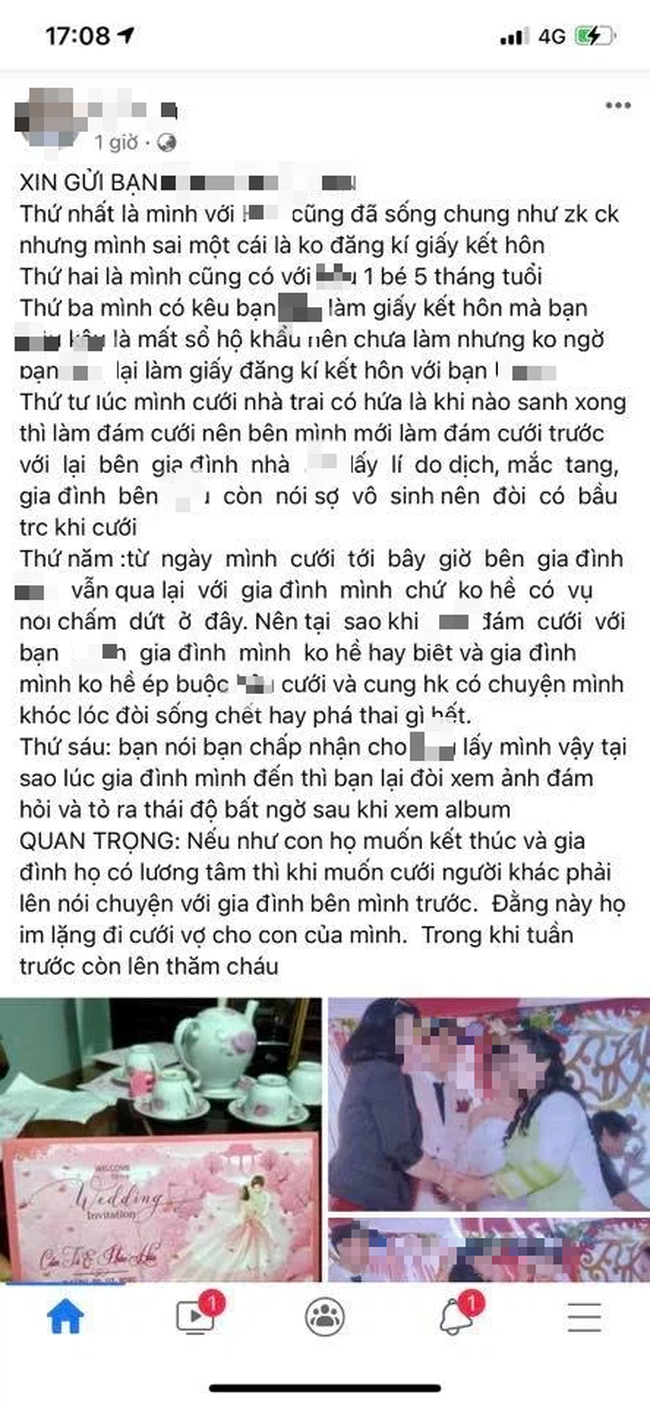 Thứ 4 là gia đình bạn ấy ép phải có trách nhiệm với con, buộc phải làm đám hỏi, đám cưới nếu không làm thì sẽ phá thai, bạn ấy khóc lóc đòi sống đòi chết này nọ. Gia đình bạn ấy nói rằng giải quyết xong xuôi thì chồng mình muốn đi đâu muốn lấy ai thì lấy. Mình và chồng bàn bạc xong xuôi chấp nhận chuyện đó vì thương con nhỏ (Lúc 1 năm trước sao không phá mà đến đúng ngày cưới mình thì gia đình bạn đó đăng lên mạng đòi phá cho bằng được).