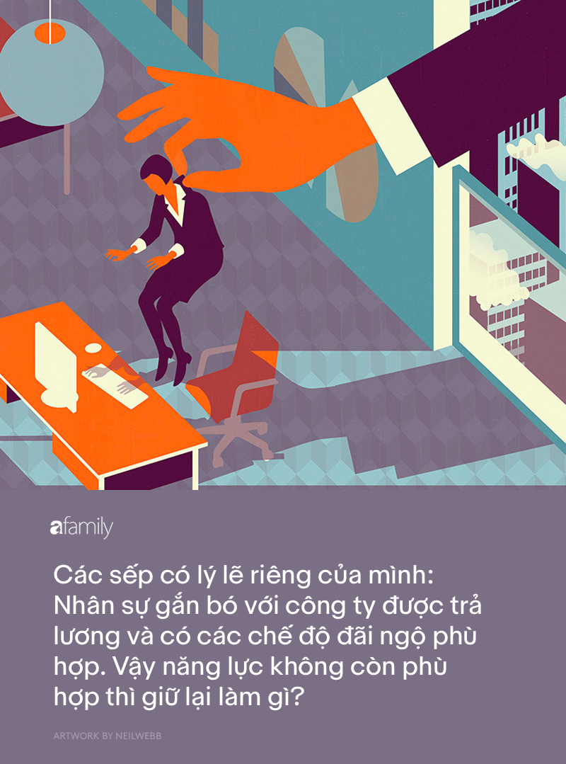 Sếp có lý do của mình trong câu chuyện này. Một nhân sự gắn bó với công ty không phải gắn bó không công, họ đã được trả lương hàng tháng và có các chế độ đãi ngộ phù hợp (hoặc chí ít, họ cũng chấp nhận những đãi ngộ ấy). Vậy cả thanh xuân của họ đã được đánh đổi công bằng thì chuyện gì đi chuyện đấy còn điều gì phàn nàn nữa nếu phải nghỉ việc? Năng lực không phù hợp thì còn lý do gì để giữ lại?