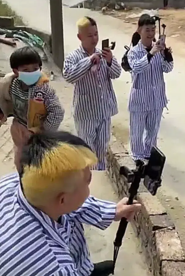 Theo đoạn video mới nhất được lan truyền trên mạng, một nhóm đàn ông mặc áo bệnh viện và cạo trọc đầu theo phong cách "âm dương cách biệt" đang hoạt động trở lại, với điện thoại di động và gậy tự sướng.