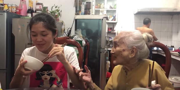 | Bà ngoại 94 tuổi hát ''bài ca lấy chồng đi'' nhắc cháu gái trong bữa ăn gây sốt mạng xã hội. Nguồn: Linh Khánh Hà |