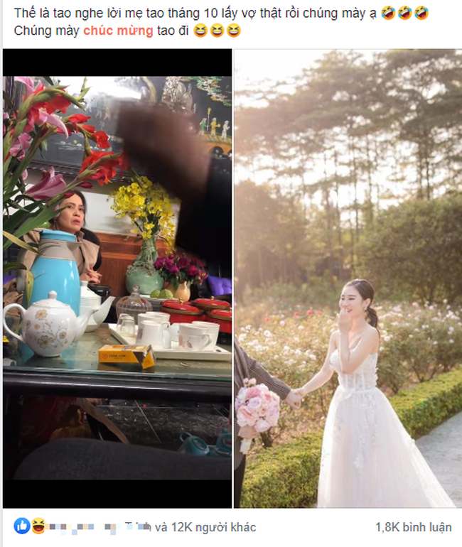 Mới đây, chàng trai Nguyễn Thành Đạt ngót nghét 30 mùa xuân đã lên group khoe: "Thế là tao nghe lời mẹ tao tháng 10 lấy vợ thật rồi chúng mày ạ. Chúng mày chúc mừng tao đi". Dòng trạng thái cực ngắn kèm 1 bức ảnh cưới và đoạn video tranh luận của 2 vị phụ huynh mà bài đăng của Đạt nhận về 12k like cùng vô số bình luận.